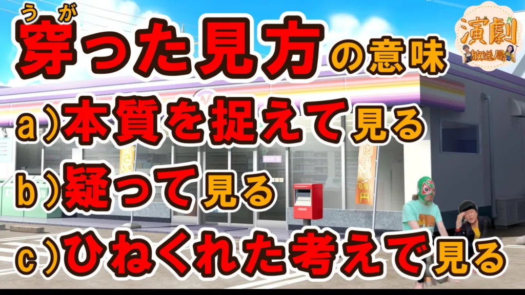 穿ったの意味は?どんな見方?a)物事の本質を鋭く見る b)疑って見る c)捻くれた考えで見る https://youtu.be/GSGQKCpP-Ps -